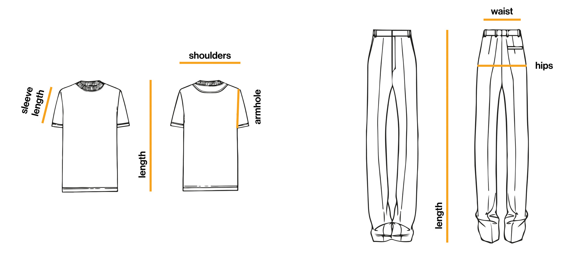 Waist: we measure, for example for pants and skirts, from one side to the other (horizontally) of the strap at the back of the garment. The measurement then corresponds not to the waist intended as circumference, but as the measurement of the waist behind the garment flat.