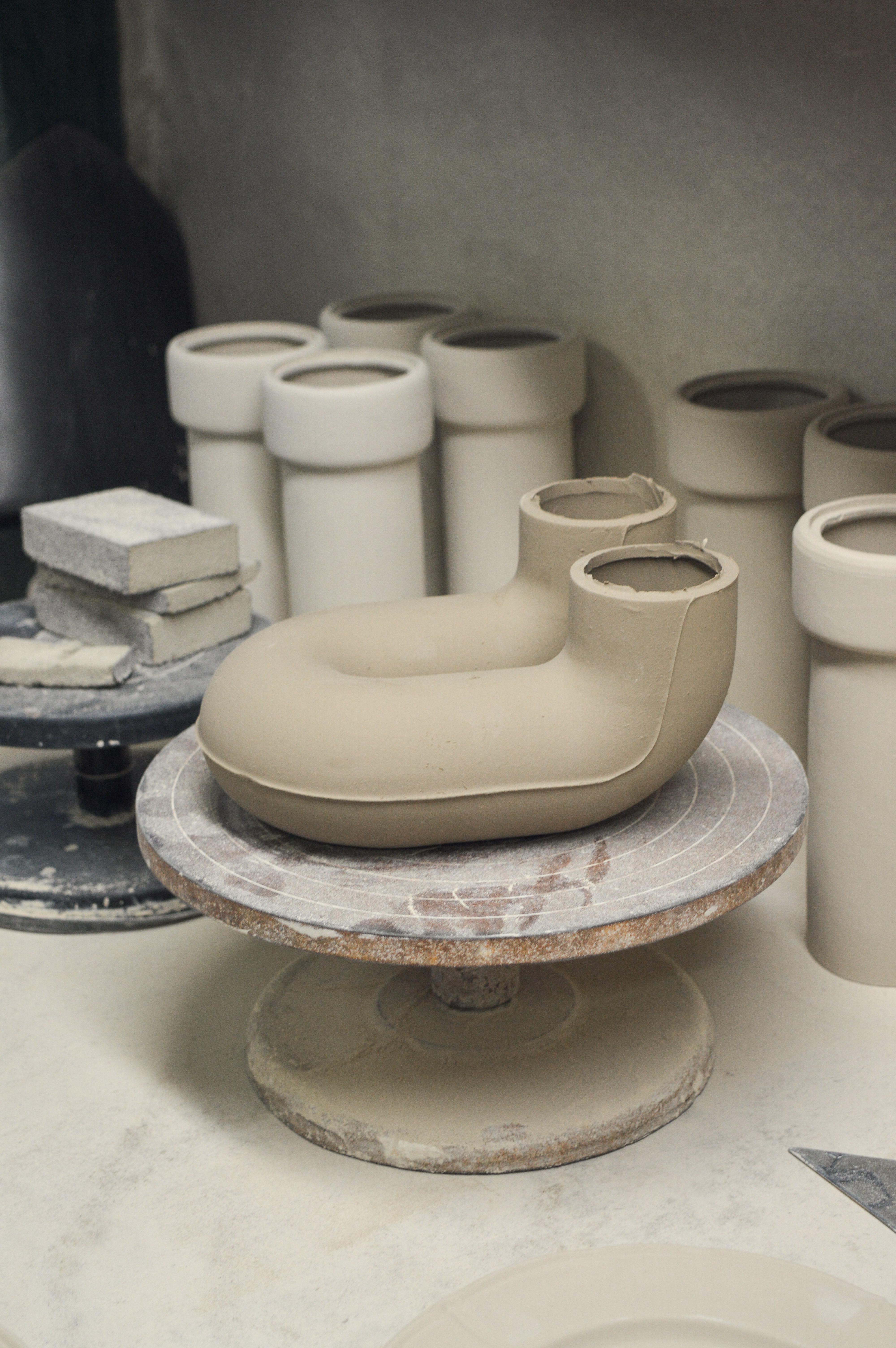 AB is a pair of ceramic vases designed to explore the relationship between fullness and void, height and proportion. Two distinct volumes, Alto and Basso, that can live together or independently, always maintaining a strong sculptural presence.